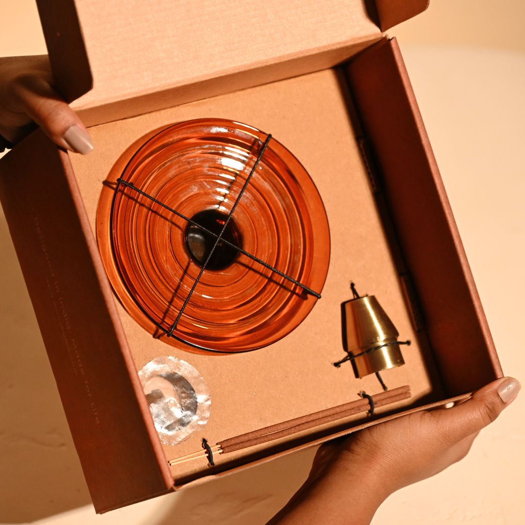 What's in the box? 1 Amber Glass Incense Holder Base + 1 Brass Incense Holder Insert + 2 Dhoop Cones + 2 Incense Holders.